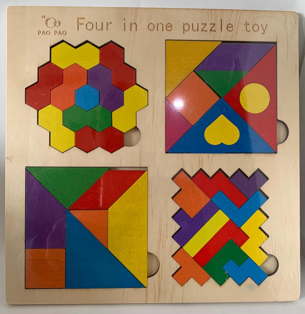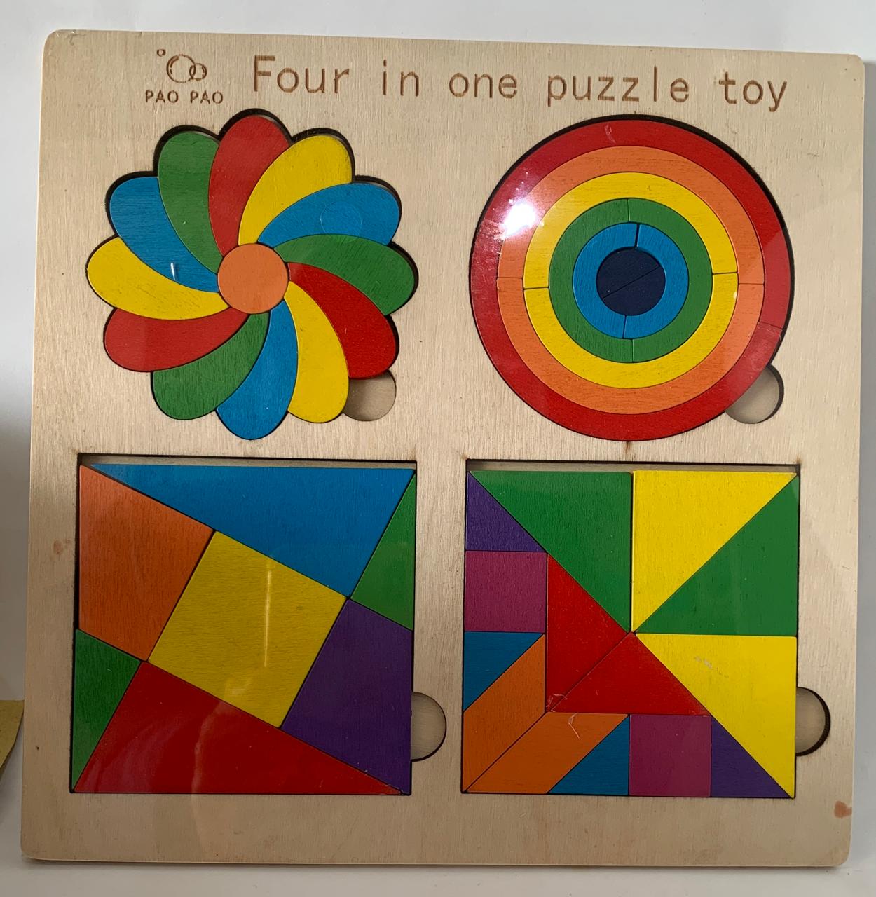 Colorful 4-in-1 wooden puzzle toy that helps kids learn different printed at the back shapes, colors, and problem-solving through fun and creative play.